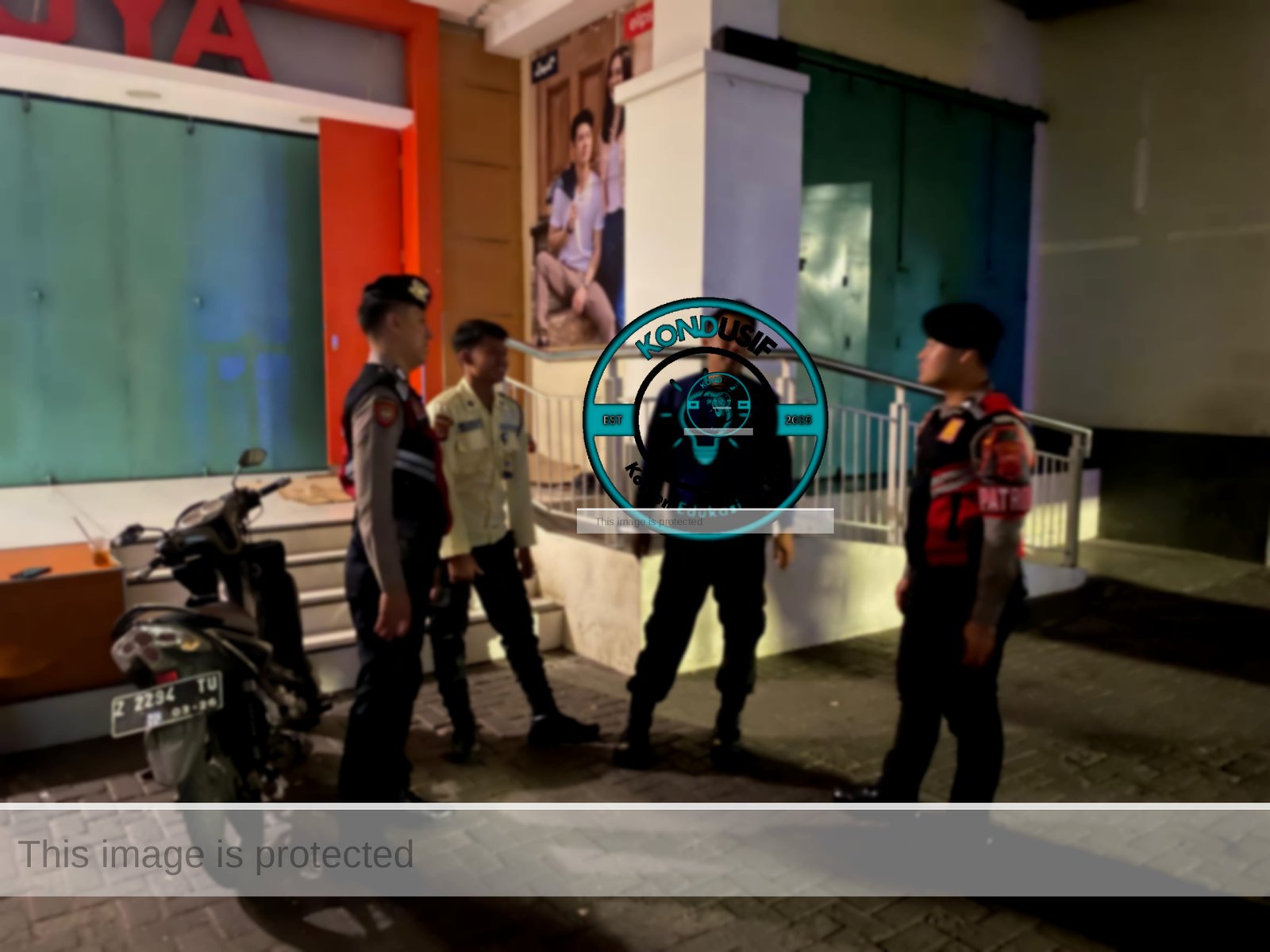 Mereka tidak hanya melintas, tetapi aktif berhenti untuk berdialog dengan petugas keamanan swalayan dan warga yang masih beraktivitas di luar rumah.